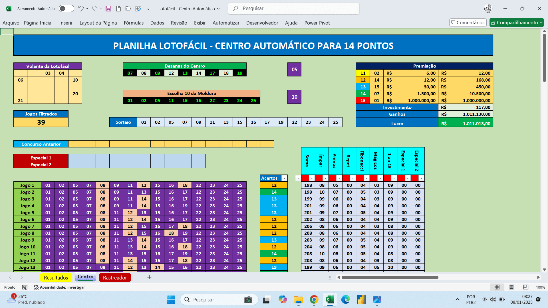 Planilha da Lotofácil que joga com as 9 dezenas do centro automáticas, ou seja, já estão combinadas.