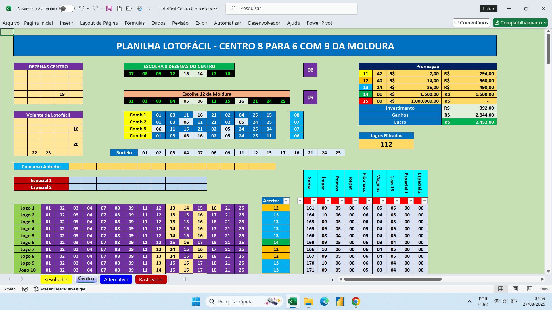 Planilha Lotofácil onde escolhe 8 dezenas do miolo e elas são reduzidas para 6