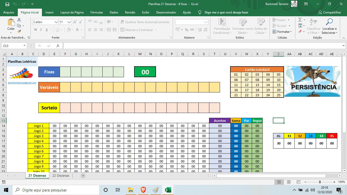 Planilha Lotofácil que joga com 21 dezenas e 6 fixas em apenas 30 Jogos.