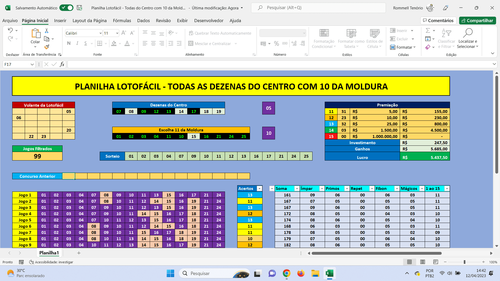 Planilha Lotofácil – Todas as Dezenas do Centro com 10 da Moldura